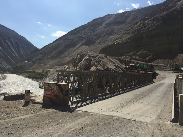 Allerding bläst in dem Tal nun ein extrem böiger Wind, der es immer wieder schafft, mich an Stellen zu treiben, wo ich nicht hin will. So auch auf einer Brücke, auf der ich dann in einem Loch lande, das sich mittendrin zeigt. Nochmal Glück gehabt. Ich kann es gerade noch erbremsen und falle nicht um! An einer Brücke sehe ich auf der anderen Seite eine perfekte Teestraße! Ein Blick auf die Karte sagt mir jedoch, dass diese Straße in eine völlig falsche Richtung führt. Also weiter mit den Steinderln. Immer wieder muss ich anhalten, wenn Bauarbeiter notwendige Arbeiten durchführen oder gar die Straße von Felsbrocken und Geröll befreien.
